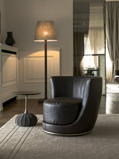 Այս նրբագեղ աթոռը, որը տեղադրված է մետաղական հիմքի վրա, առանձնանում է լայն, կոմպակտ, կատարյալ կլոր նստատեղով: