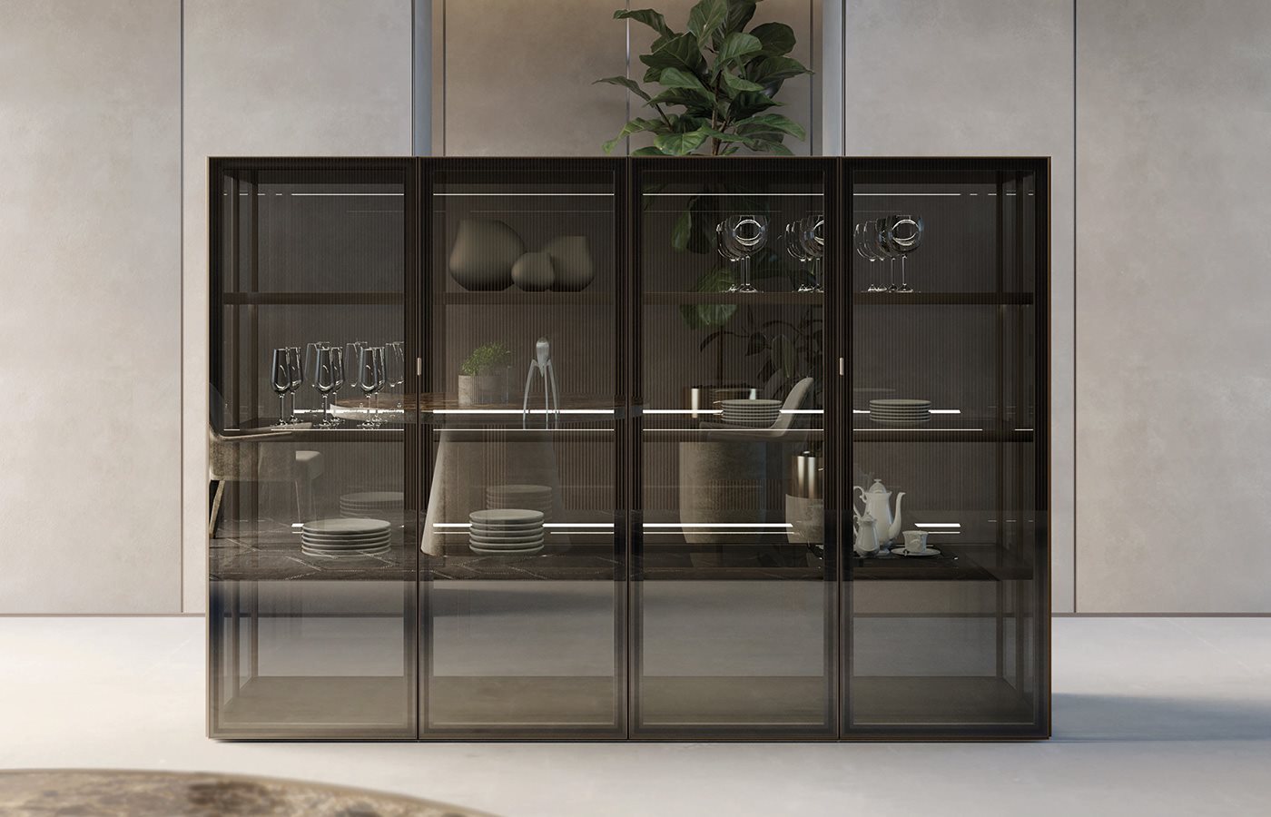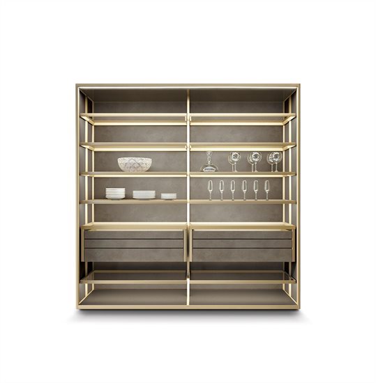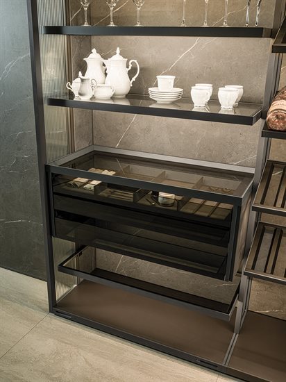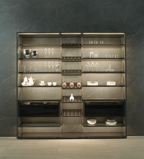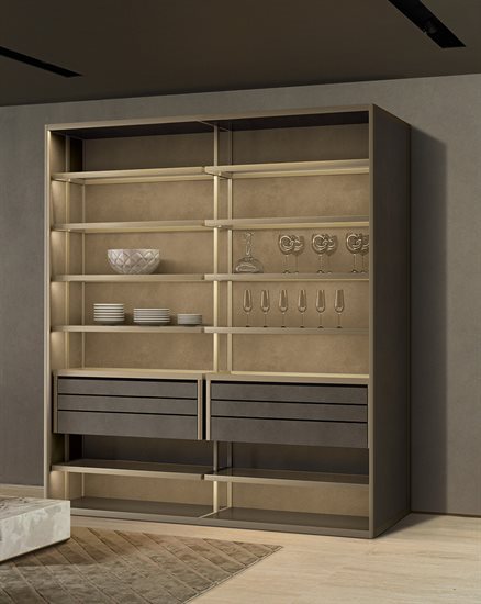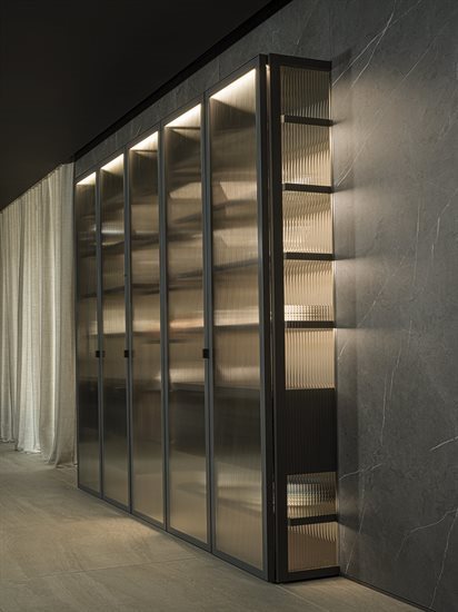 ապակե հետևի վահանակ՝ կղզյակ տեղադրելու համար, և յուրաքանչյուր մոդուլը բաժանող պրոֆիլ, որը թույլ է տալիս զգեստապահարանի դռներին անթերի համադրվել բուազերի վահանակների հետ: Յուրաքանչյուր դարակի LED լուսավորությունը բարելավում է տարածքը և ստեղծում հաճելի մթնոլորտ:
