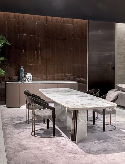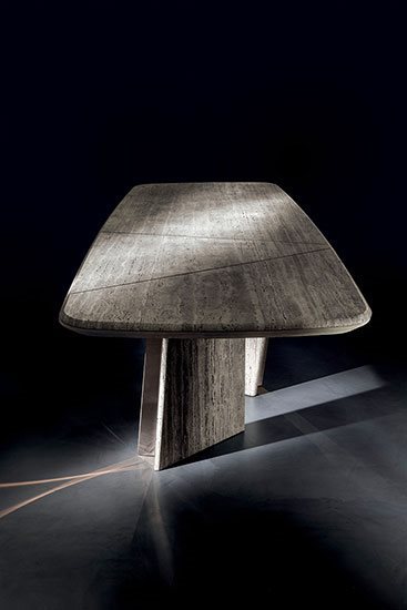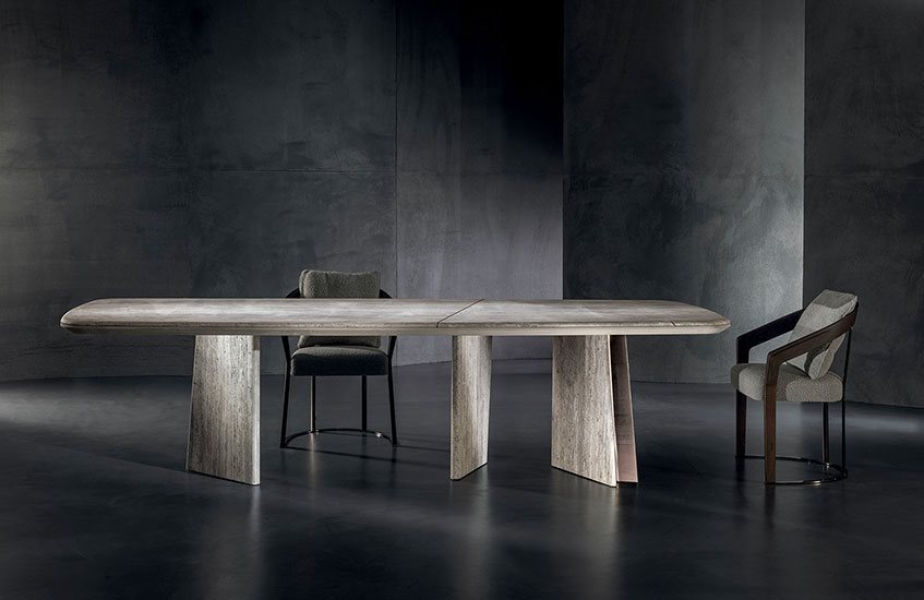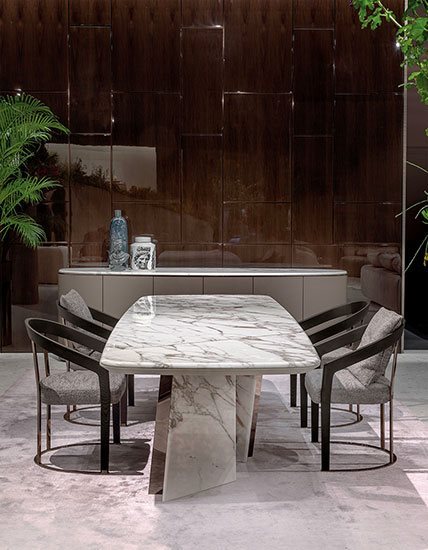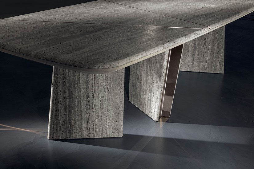Այս ճաշասեղանը մաքուր երկրաչափական ձևերի նուրբ համադրություն է, որը զարդարված է կլորացված մետաղական ոտքերի դետալով, որը ստեղծում է լույսի և ստվերի գրավիչ խաղ: Հիմքերի թվացյալ պատահական դիրքը սահմանում է բազմակողմանի իր, որը հասանելի է ոճերի լայն տեսականիով՝ ավելի դասական, պաշտոնական դիզայնից մինչև ամենահամարձակ չափսերը: